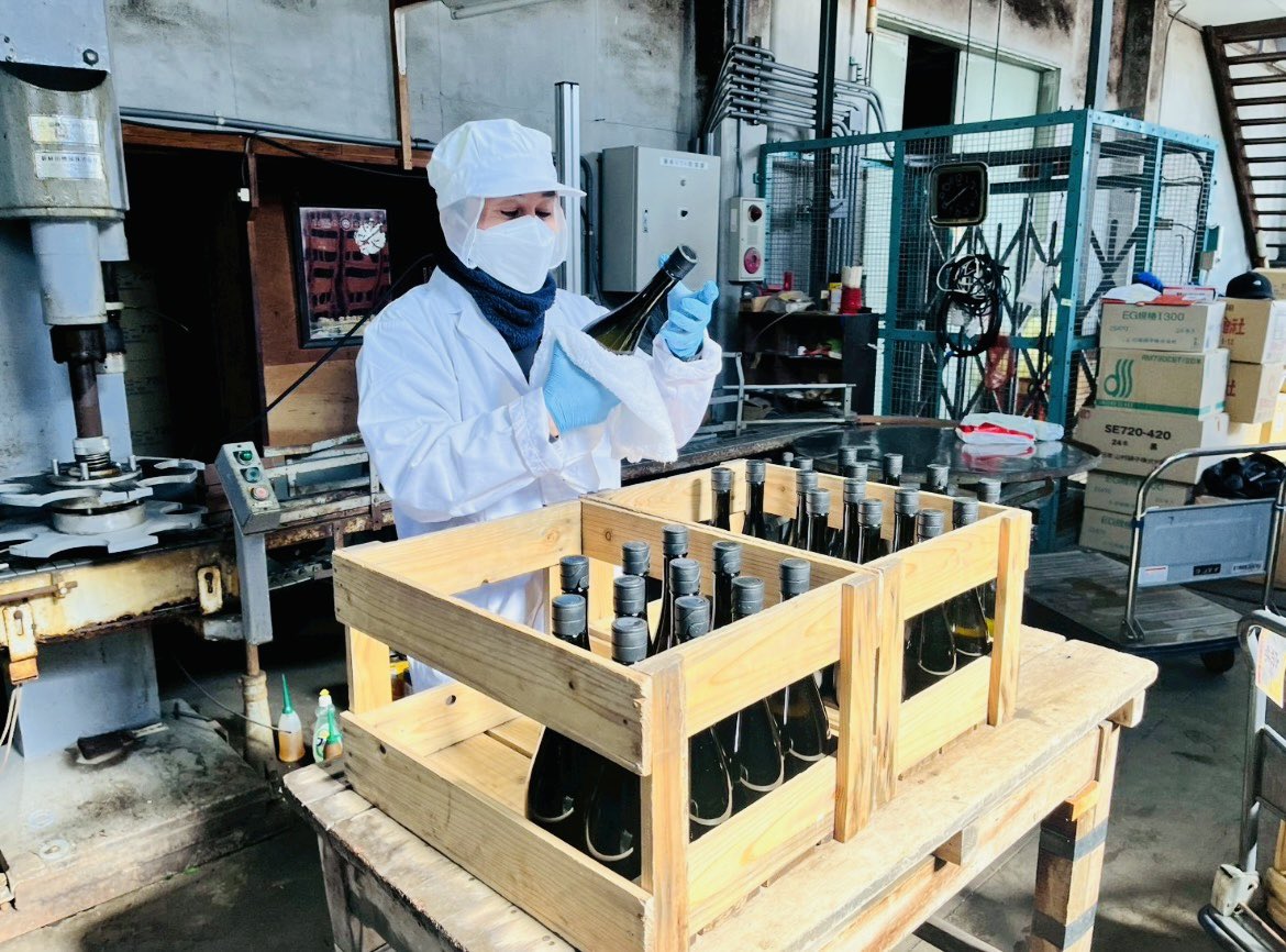 瓶詰めされた日本酒は、出荷前に一本一本丁寧に手作業で拭き上げを行っています。